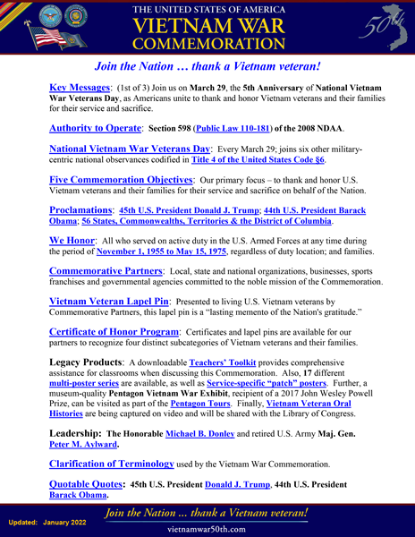 This national commemoration was authorized by Congress, established under the Secretary of Defense, and launched by the President to thank and honor our Nation’s Vietnam veterans and their families for their service and sacrifice.
