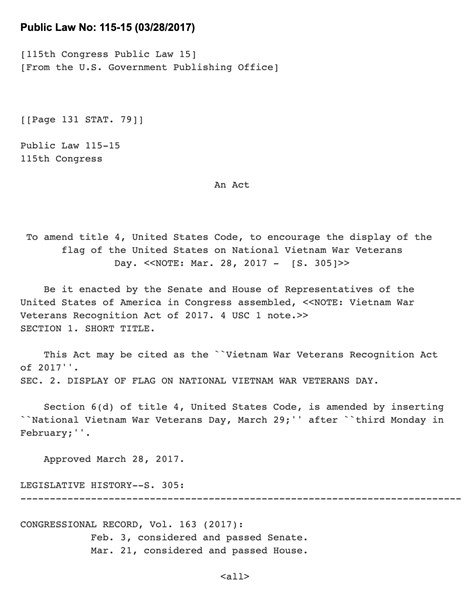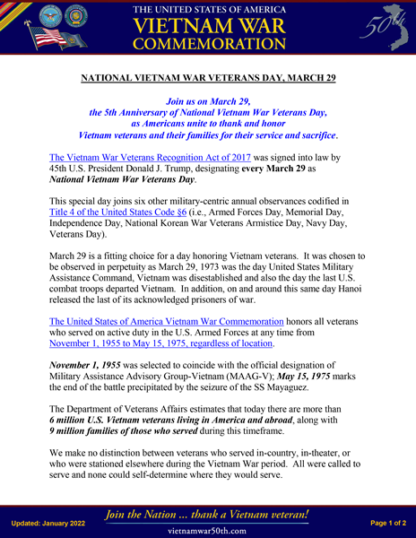 The Vietnam War Veterans Recognition Act of 2017 was signed into law by 45th U.S. President Donald J. Trump, designating every March 29 as National Vietnam War Veterans Day.